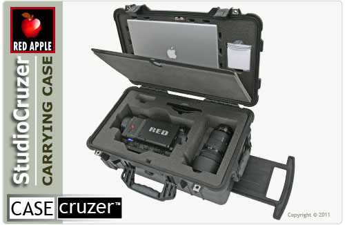 Overcome Fear of Flying - Finally a carry-on solution for your expensive cinematography gear; the Red Apple StudioCruzer allows you to bring along the body of your Red Digital Camera; inside the lid you will be able to safely store your Apple MacBook Pro laptop (available for the 15" or 17”). The lower section of the Red Apple StudioCruzer case also accommodates the Red LCD Viewfinder and one Lens (up to the Red 300mm prime lens). |